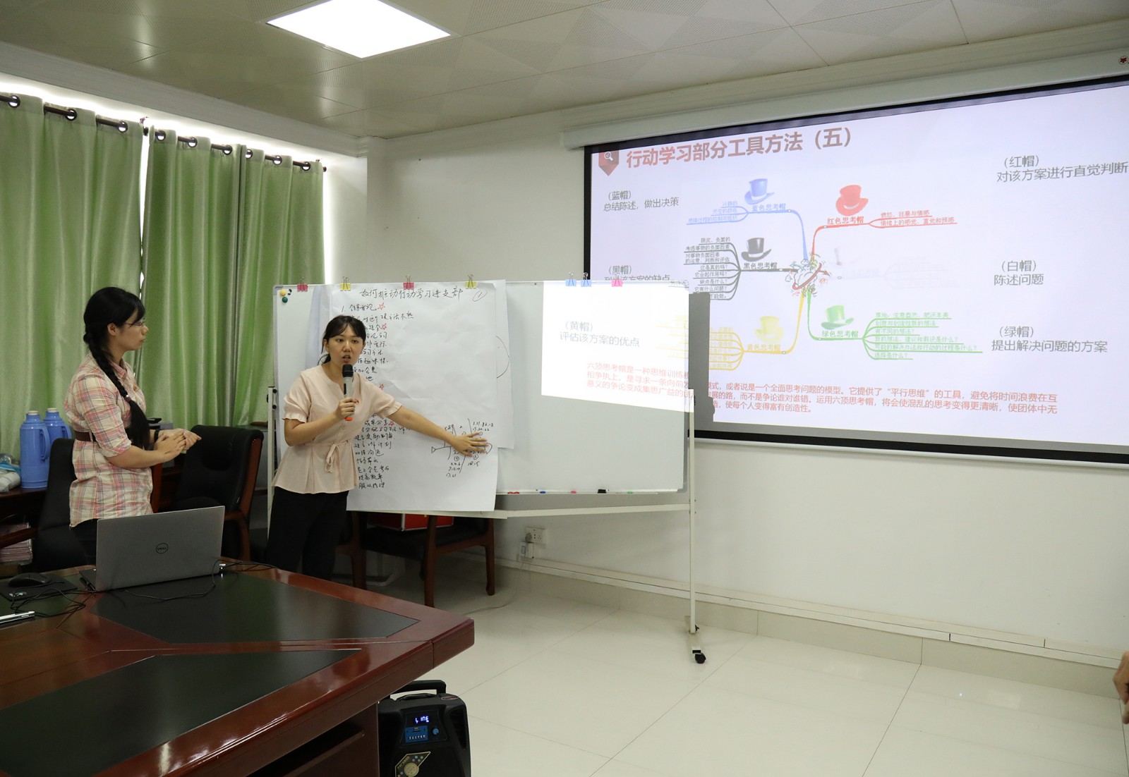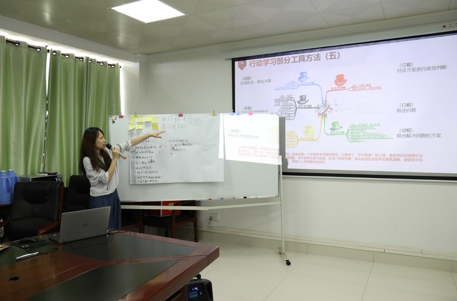 隨后各小組派代表依次上臺分享小組研討成果,其他小組則分別運(yùn)用“黃帽子”(好的)和“黑帽子”(不足)對其他小組展示成果進(jìn)行點評。在實操演練過程中,各小組成員積極參與踴躍發(fā)言,會場研討學(xué)習(xí)氛圍濃厚,大家在學(xué)習(xí)、討論、交流的過程中增長了用行動學(xué)習(xí)方法、工具解決實際問題的能力。